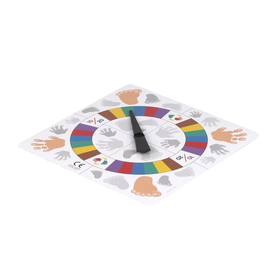 A spinner dictates which body part (hand or foot) and color to place on the mat.